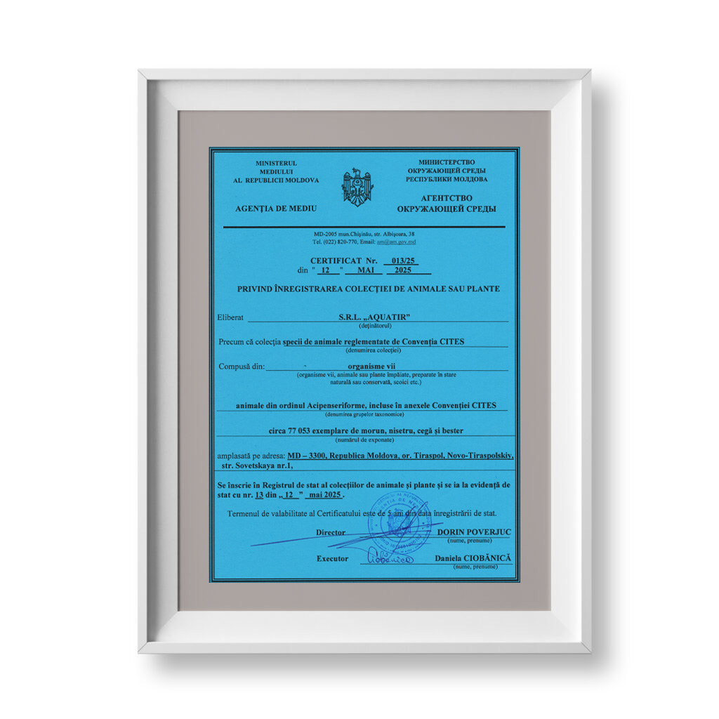 This official certificate, issued by the Ministry of Environment of the Republic of Moldova, confirms the registration of Aquatir’s sturgeon collection under the CITES Convention. It validates that approximately 77,053 specimens of sturgeon species are kept at the company’s facility in Tiraspol, ensuring compliance with international regulations for the protection and sustainable use of endangered species.