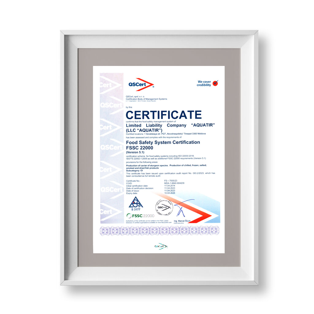 Granted by QSCert, this document certifies that Aquatir’s food safety management system complies with the international FSSC 22000 standard (Version 5.1). It covers the production of chilled, frozen, and salted sturgeon caviar and fish products. This certificate guarantees that Aquatir meets strict global requirements for food safety, hygiene, and traceability.