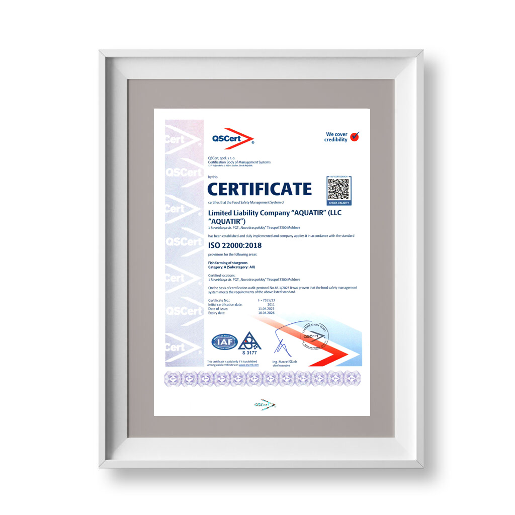This certificate demonstrates that Aquatir operates in accordance with the ISO 22000:2018 international food safety standard. It specifically applies to the production of fish and caviar from sturgeon species. By obtaining this certification, Aquatir ensures that its processes are controlled, transparent, and focused on delivering products of the highest safety and quality to the global market.